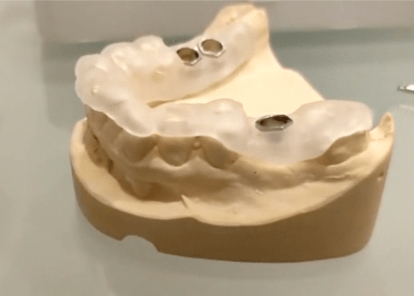 STEP 4: Il giorno del tuo intervento non ci sarà spazio all'improvvisazione, tutto è stato già deciso e programmato in anticipo. A questo punto non ci resta che posizionare la mascherina sui tuoi denti ed inserire gli impianti tramite gli appositi fori creati su misura. Tutto questo permette di rendere l'intervento rapido, non invasivo ed anche estremamente sicuro.