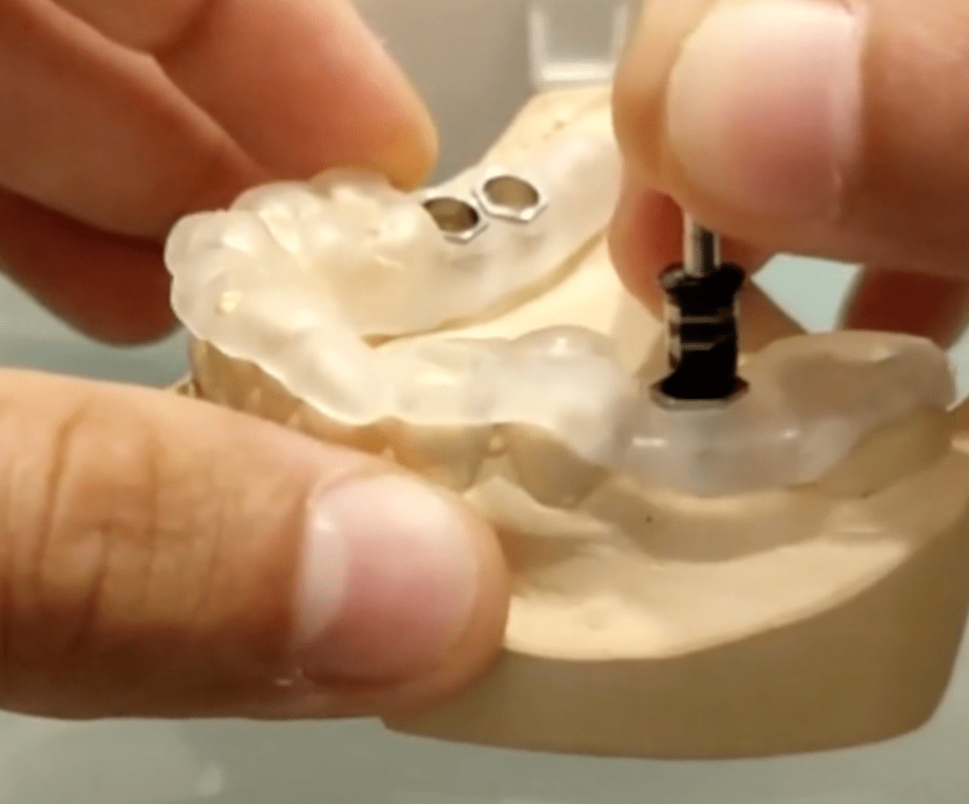 STEP 4:  Il giorno del tuo intervento non ci sarà spazio all'improvvisazione, tutto è stato già deciso e programmato in anticipo. A questo punto non ci resta che posizionare la mascherina sui tuoi denti ed inserire gli impianti tramite gli appositi fori creati su misura. Tutto questo permette di rendere l'intervento rapido, non invasivo ed anche estremamente sicuro.